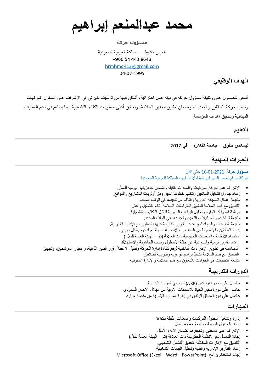 مراقب حركة بخبرة في إدارة وتشغيل أسطول المركبات والمعدات، ومتابعة خطوط السير اليومية لضمان كفاءة التشغيل. خبرة في تنظيم حركة السائقين، متابعة الصيانة الدورية، وتقليل الأعطال والتأخيرات. أجيد اعداد تقارير الحركة، مراقبة استهلاك الوقود، والتنسيق مع الأقسام المختلفة لضمان سير العمل بكفاءة ووفق خطط التشغيل