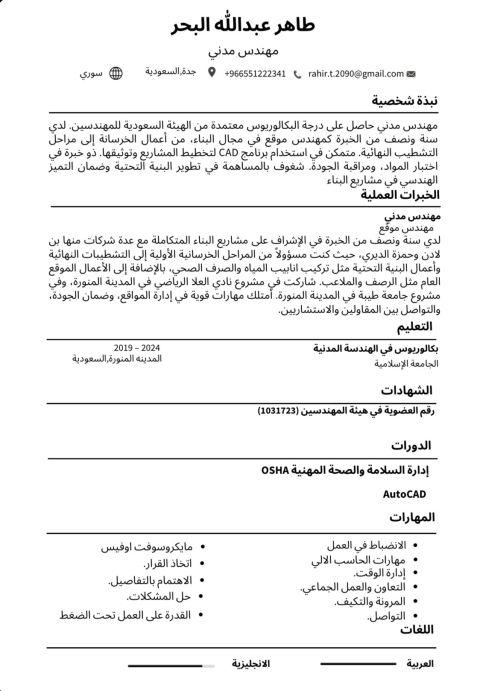 مهندس مدني معتمد في الهيئة السعودية للمهندسين بخبرة سنة ونصف في أعمال الخرسانات والتشطيبات النهائية وأعمال الموقع العام من أرصفة وملاعب