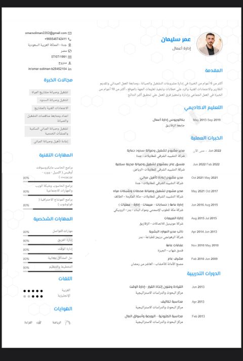 خبرة في ادارة المشاريع الحكومية (التشغيل والصيانة) خبرة بمنصة اعتماد والتقديم علي المنافسات وتجهيز متطلبات العروض المالية والفنية وادارة قبول العروض الفنية عمر سليمان