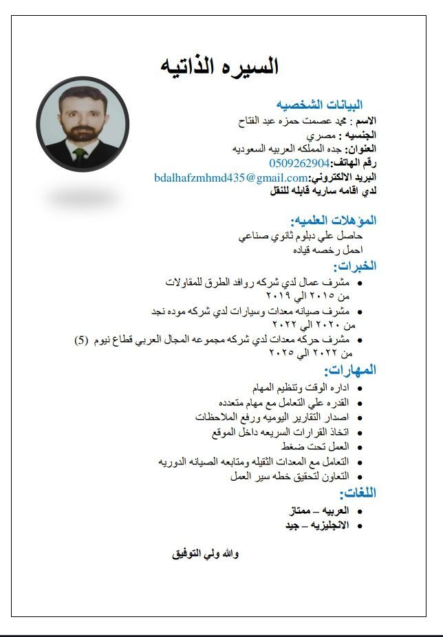 مشرف عمال وحركة معدات خبرة 10 سنوات في مجال المقاولات