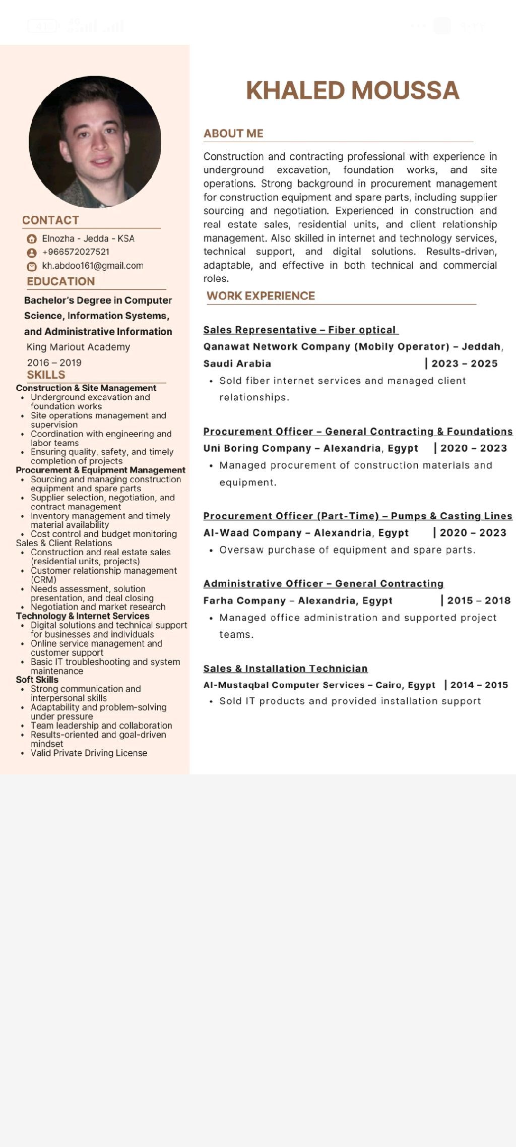 ابحث عن دوام كامل في مجال المقاولات العامة عملت في مجال المشتريات لدي شركات حفر الأساسات ومضخات الخرسانة لمدة 4 أعوام وعملت لدي شركات العقارات بيع واشراف علي التشطيبات