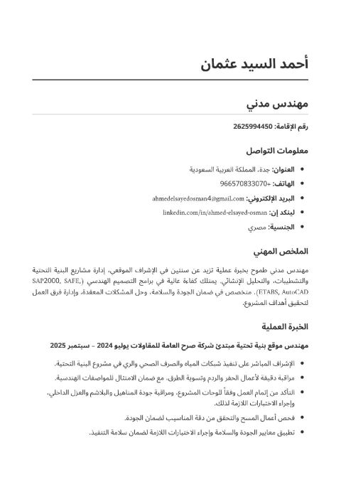 I am a civil engineer with 8 years of experience, located in Jeddah. I am looking for a job opportunity to work anywhere in the Kingdom. I worked as a quantity surveyor and technical office engineer for power stations, infrastructure works, and construction works. I worked as an implementation engineer in residential building and villa projects, from excavation until delivery. I am good at working