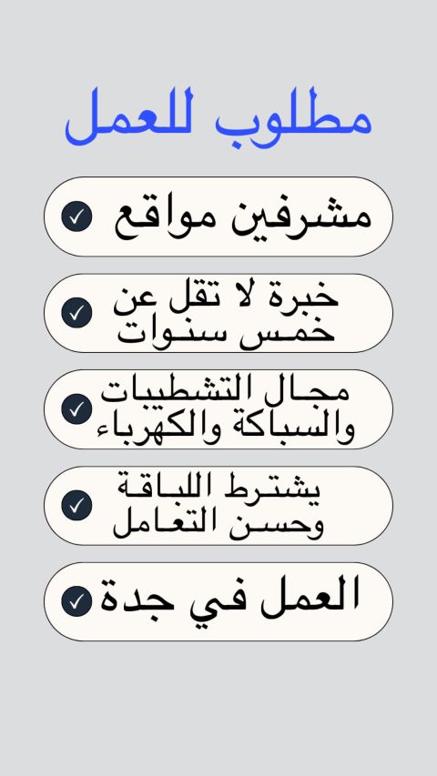مطلوب مشرف محترف في مجالات السباكة والكهرباء والتشطيبات لمشاريع سكنية وتجارية بخبرة لا تقل عن 5 سنوات ومعرفة بأسعار السوق والمواد وقدرة على توفير فنيين احترافيين بمختلف المجالات. ويشترط اللباقة وحسن التعامل أثناء العمل. من المهم توفر مركبة حيث أن موقع العمل بمدينة جدة حي الحمدانية وحسب موقع المشروع. يرجى إرسال السيرة الذاتية والأعمال الحالية عن طريق