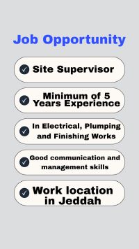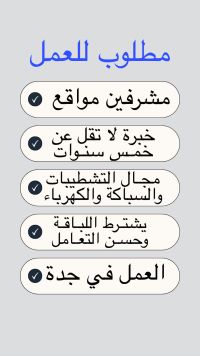 مطلوب مشرف محترف في مجالات السباكة والكهرباء والتشطيبات لمشاريع سكنية وتجارية بخبرة لا تقل عن 5 سنوات ومعرفة بأسعار السوق والمواد وقدرة على توفير فنيين احترافيين بمختلف المجالات. ويشترط اللباقة وحسن التعامل أثناء العمل. من المهم توفر مركبة حيث أن موقع العمل بمدينة جدة حي الحمدانية وحسب موقع المشروع. يرجى إرسال السيرة الذاتية والأعمال الحالية عن طريق