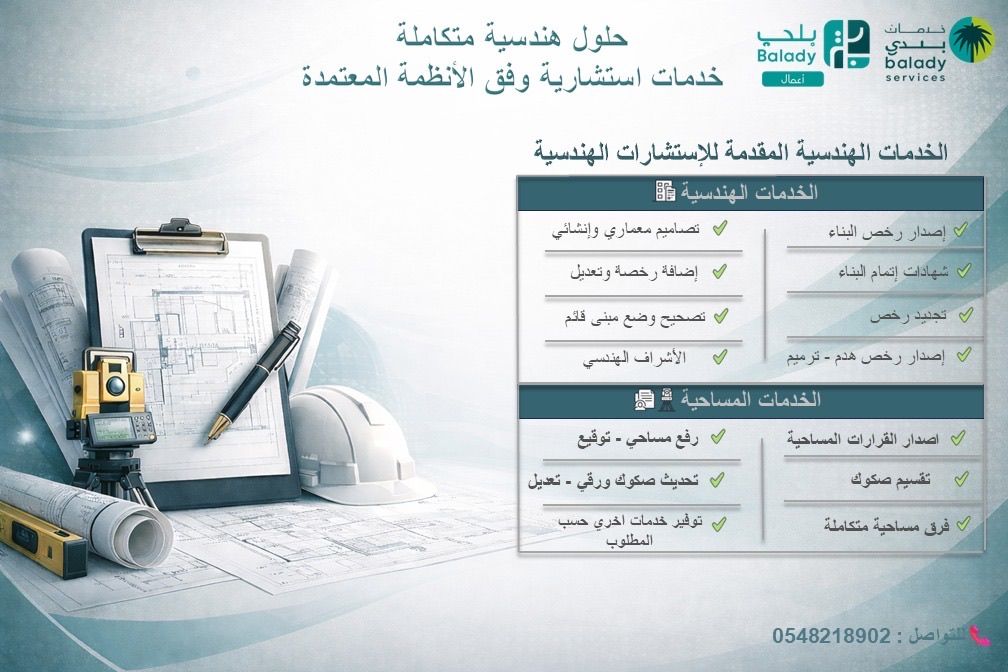 مكتب هندسي معتمد بلدي - قرار مساحي - تحديث صكوك - اصدار رخص بناء - فرز وحدات - ترميم - شهادة اتمام بناء وخدمات أخرى