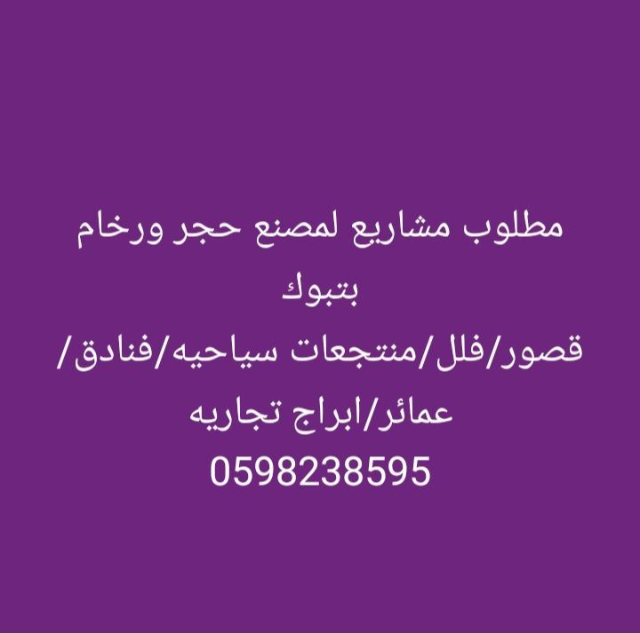 مطلوب مشاريع لمصنع حجر ورخام في تبوك قصور / فلل / منتجعات سياحية / فنادق / عمارات سكنيه / أبراج تجاريه فهذا المصنع ينتج التحف الفنيه والمنحوتات المجسمة الحجرية والرخامية وكذلك ألواح الحجر والتر أبيع والأعمدة والتيجان والادراج فان المصنع يوفر كافة احتياجات أي مبنى سكني أو تجاري أو القصر أو المسجد من الباب الى المحراب بامكان المصنع عمل قوالب الجبس والجي أر سي وغيرها من القوالب الزخرفية والمجسمات وكذلك