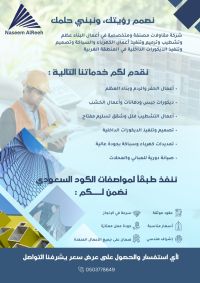مؤسسة نسيم الريح للمقاولات العامة يسعدنا تواصلكم معنا لتنفيذ ما يلي 1 - أعمال العظم بالمواد (خرسانة - بلوك - تأسيس كهرباء وسباكة) 2 - أعمال التشطيبات بالمواد أو بدون مواد 3 - أعمال الصيانة والترميمات (مصانع - شركات - مدارس - مكاتب - معارض) 4 - أعمال السباكة والكهرباء تنفيذ جميع الأعمال تحت اشراف هندسي وبأفضل جودة ممكنة وبأسعار مميزة أعمال التشطيبات تشمل ما يلي اللياسة الداخلية والخارجية (بؤج وقدة