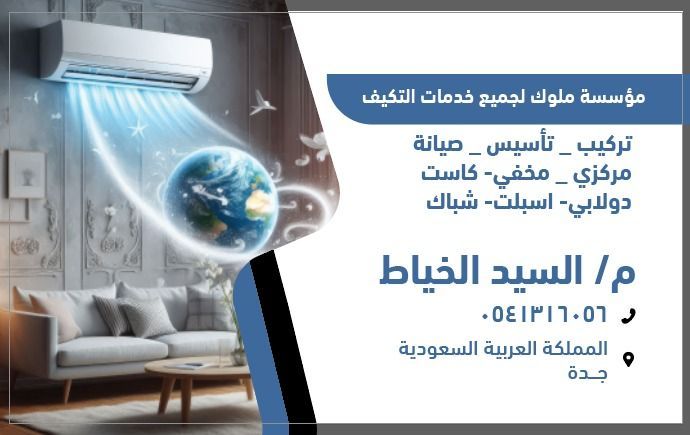 مؤسسة متخصصة في جميع خدمات التكييف تأسيس تركيب - صيانة لجميع أنواع التكيف مركزي - مخفي - دولابي كاست - سبليت - شباك ولدينا فروع في المنطقة الغربية جدة ومكة والطائف والمدينة المنورة لدينا فنيين على أعلى مستوى من الخبرة والجودة المتميزة وأسعار لا تقبل المنافسة