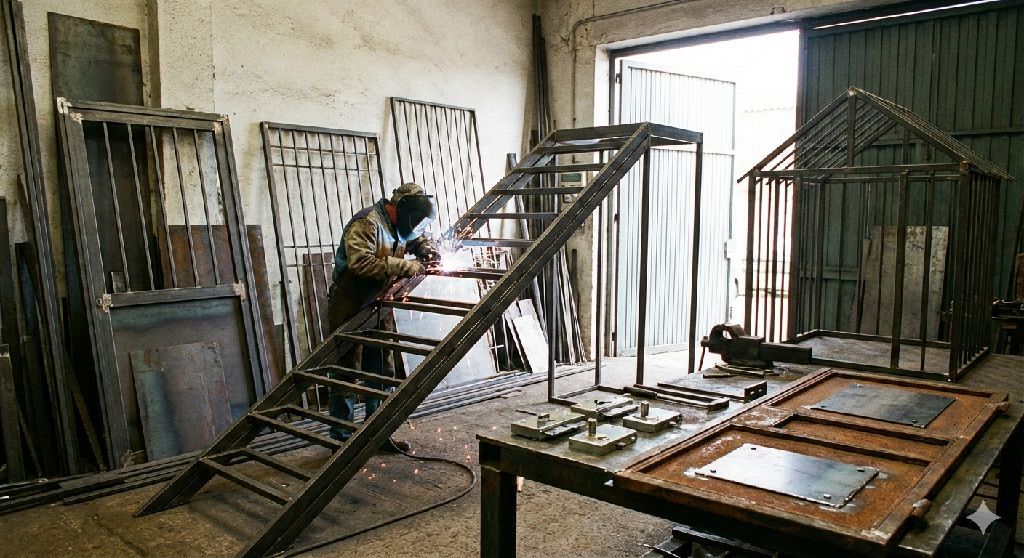 I work in a metal fabrication workshop. I handle all kinds of ironwork, including constructing iron structures (sheds) stairs, doors, and windows. I also do maintenance tasks such as installing new door locks and replacing rusted sections of doors with new iron. Workshop Metal fabrication workshop Iron structures Iron House (Sheds/ Frames) Rust Corrosion/ Rust Replacement