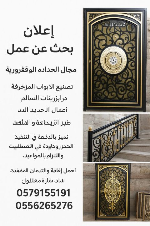 I work in the field of blacksmithing and wrought iron, and I have extensive experience in Manufacturing decorative doors Stair railings I am distinguished by precision in execution, quality in finishing, and adherence to deadlines