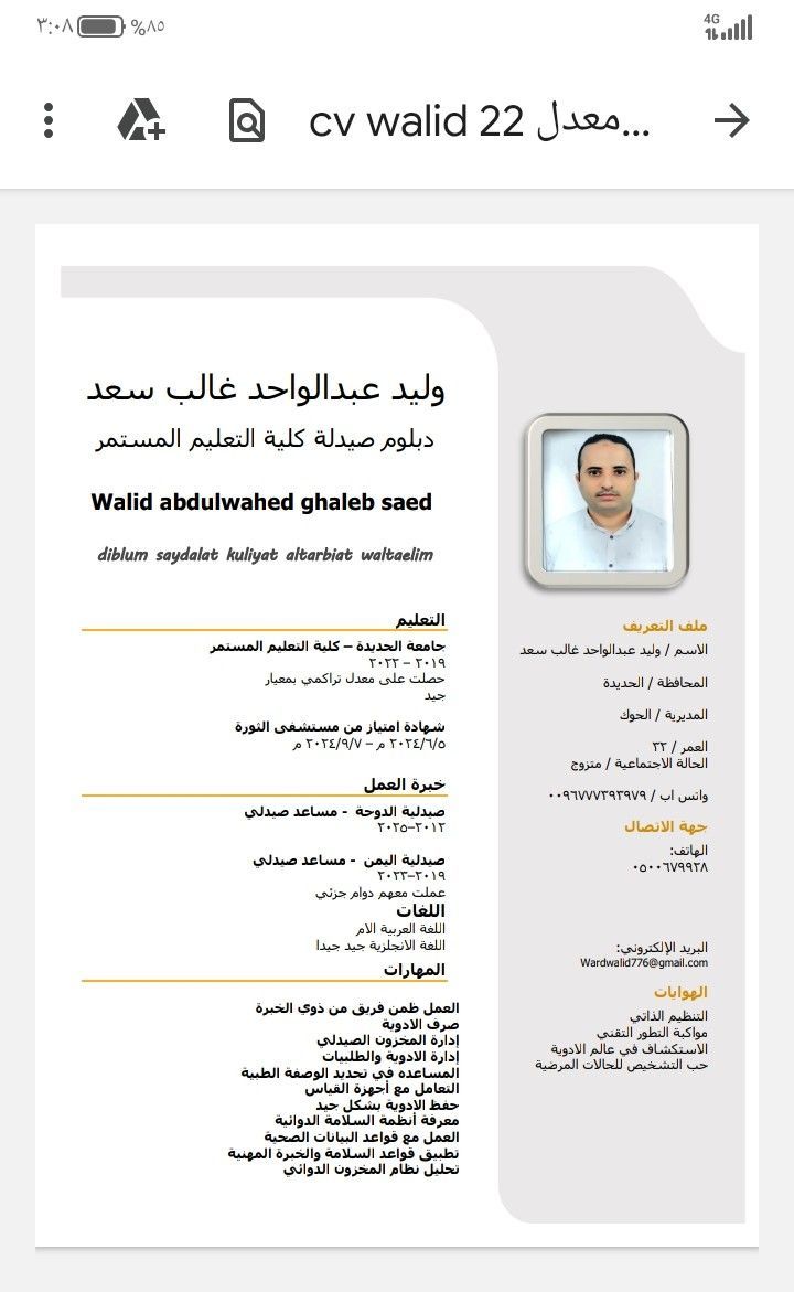 أنا وليد عبدالواحد مساعد صيدلي عملت في صيدلية مساعد صيدلي صارف ادوية مدخل ادوية في النظام المحاسبي ومراقب صلاحيتها يمكنني استخدام الكمبيوتر ويمكنني التعلم سريع على أنظمة المبيعات