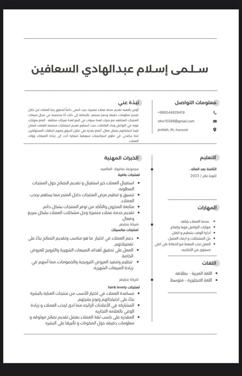 ابحث عن فرصة وظيفية تمكنني من تطوير مهاراتي واكتساب خبرات عملية جديدة والانضمام الى فريق عمل يقدر الجدية والالتزام أتميز بسرعة التعلم والقدرة على التكيف مع المهام المختلفة وأسعى لتقديم قيمة مضافة ومواجهة التحديات بروح مسؤولة وبناء مسار وظيفي مستقر يتيح لي النمو والمساهمة بفاعلية في نجاح الجهة التي أنتمي إليها