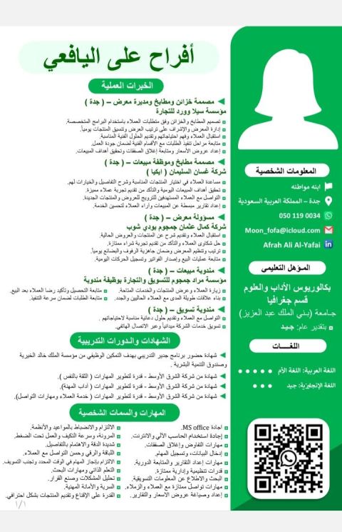 موظفة مبيعات وخدمة عملاء بخبرة في المعارض والمطابخ، أجيد التعامل مع العملاء، عرض المنتجات، اغلاق الصفقات، ومتابعة الطلبات، ابحث عن فرصة عمل مناسبة في جدة