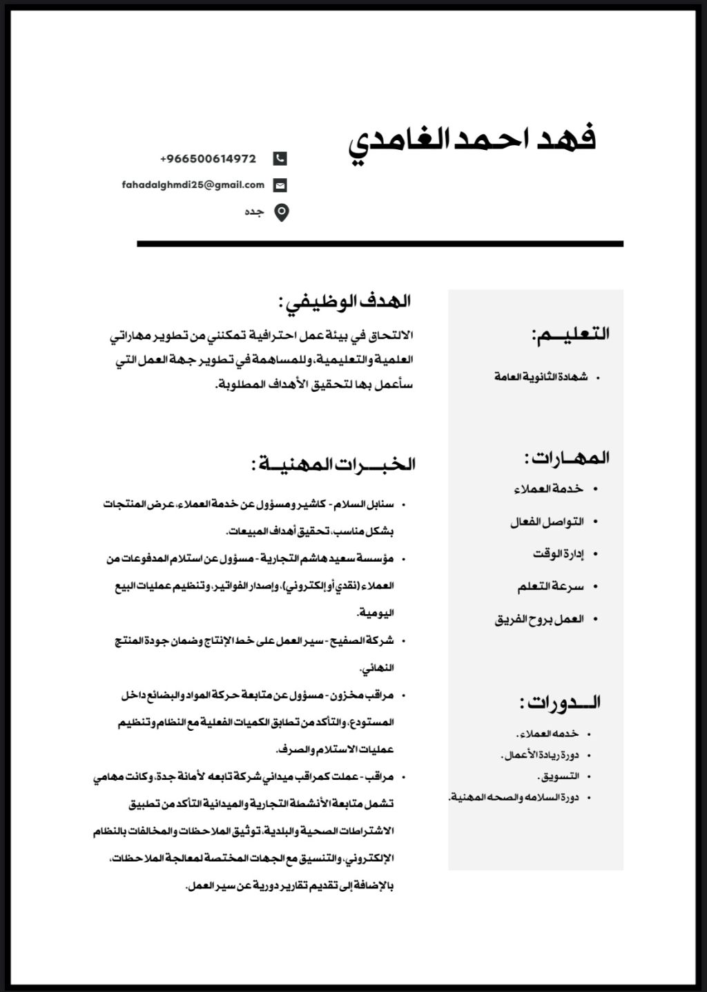 أنا فهد الغامدي من جدة، ابحث عن فرصة عمل في بيئة احترافية أطور فيها مهاراتي وأسهم في تحقيق أهداف الجهة التي اعمل بها. لدي خبرة في خدمة العملاء، المبيعات، والمخزون، وأتميز بالتواصل الفعال وسرعة التعلم والعمل بروح الفريق. للتواصل