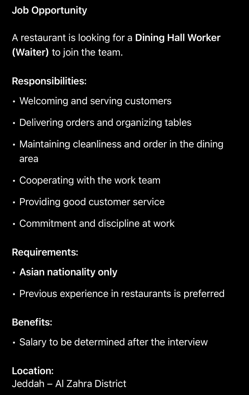 A restaurant is looking for a Dining Hall Worker (Waiter) to join the team. Responsibilities Welcoming and serving customers Delivering orders and organizing tables Maintaining cleanliness and order in the dining area Cooperating with the work team Providing good customer service Commitment and discipline at work Requirements Asian nationality only (Location Jeddah al zhrah district)