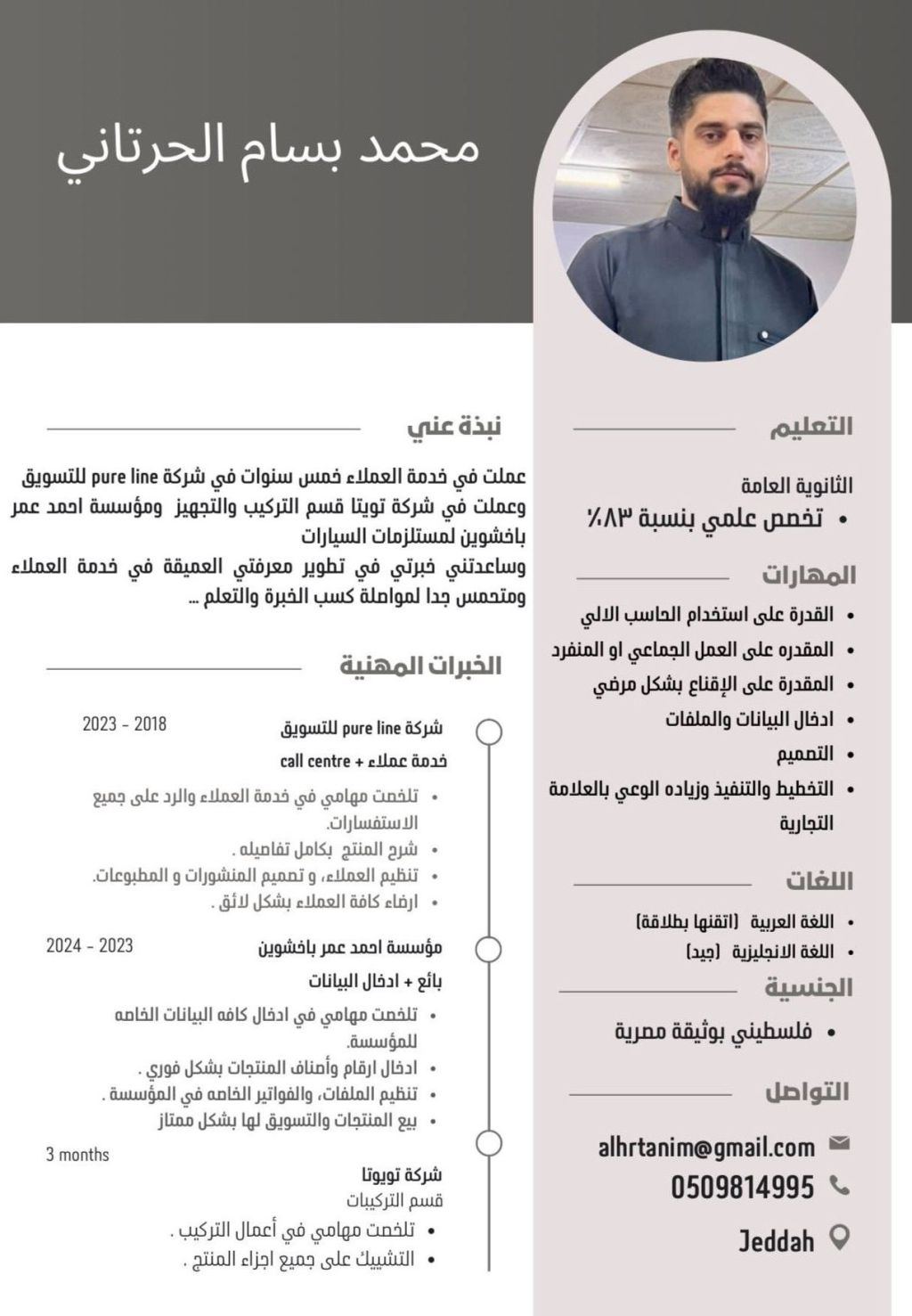 ابحث عن وظيفة خدمة عملاء في مدينة جدة أنا فلسطيني بوثيقة مصرية وإقامة سارية المفعول لدي خبرة في مجال خدمة العملاء خمس سنوات. السيرة الذاتية مرفقه