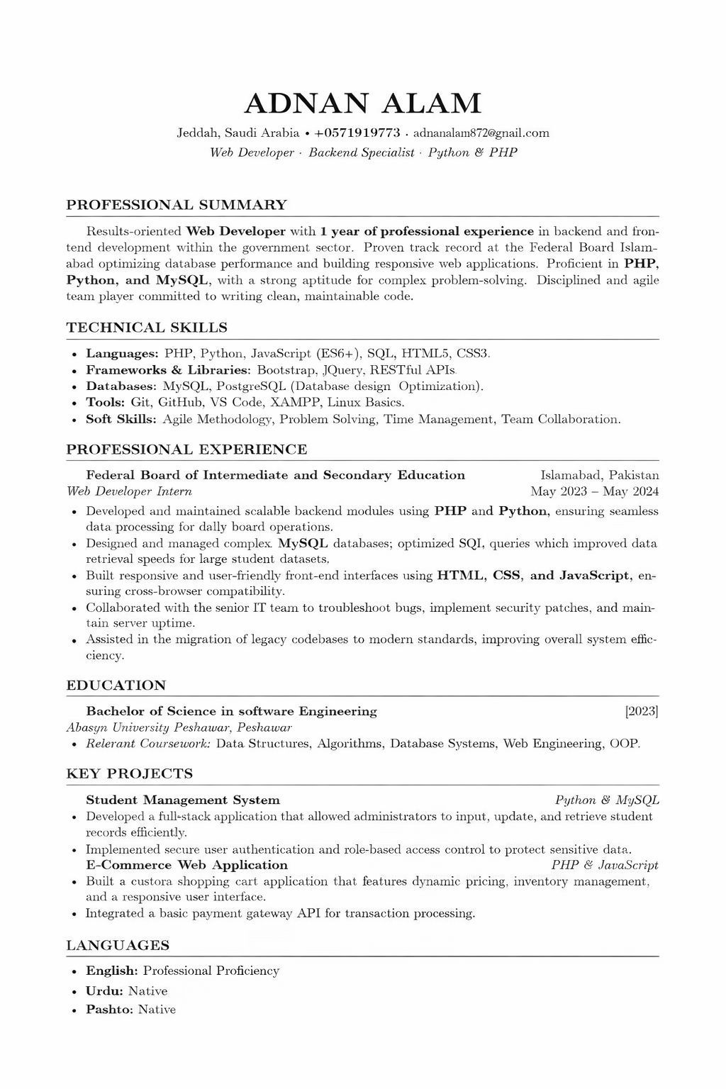 أنا مدخل بيانات محترف بخبرة سنة واحدة. أجيد استخدام برامج مايكروسوفت أوفيس، وخاصة وورد، وبوربوينت، واكسل. لدي أيضا خبرة في لغات البرمجة، بما في ذلك بايثون، وجافا سكريبت، وHTML، وCSS. كما أجيد التعامل مع قواعد البيانات، مثل MySQL، وSQL، وAccess. أنا على استعداد للعمل في أي من المجالات المذكورة أعلاه. يرجى التواصل معي عبر الهاتف أو البريد الألكتروني