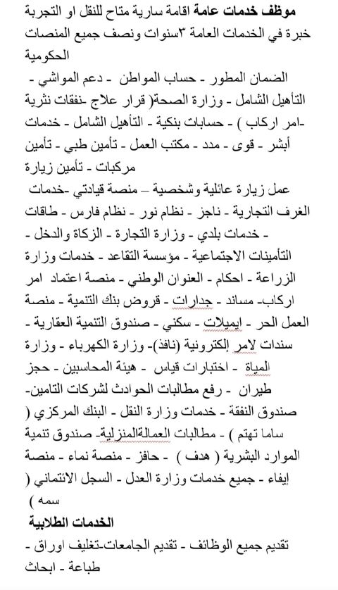 موظف خدمات عامة إقامة سارية متاح للنقل خبرة في الخدمات العامة جميع المنصات الحكومية الضمان المطور - حساب المواطن - دعم المواشي - التأهيل الشامل - وزارة الصحة (قرار علاج - نفقات نثرية - أمر أركاب) حسابات بنكية - التأهيل الشامل - خدمات ابشر - قوى - مدد - مكتب العمل - تأمين طبي - تأمين مركبات - تأمين زيارة عمل زيارة عائلية وشخصية - خدمات الغرف التجارية - ناجز - نظام نور