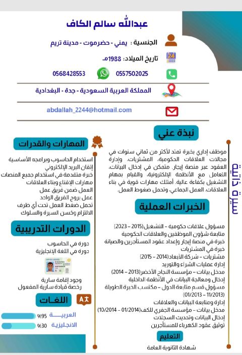 أنا شاب يمني حضرمي مقيم في جدة ولدي رخصة سواقة وإقامة نظامية ابحث عن عمل في جدة أو مكة أجيد استخدام الكمبيوتر ولدي خبرة في استخدام جميع المنصات، ومنصة إيجار وخبرة في المشتريات والصيانة والاشراف ولدي خبرة في ادارة المطاعم