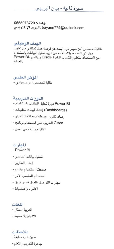 أرفق لكم سيرتي الذاتية للتقديم على أي فرصة عمل مناسبة ضمن مجال أمن المعلومات أو تحليل البيانات. أنا متحمسة لتعلم واكتساب الخبرة، وأؤكد التزامي بالعمل. شكرا لوقتكم واهتمامكم