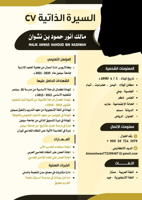 عبد الله، مصري، 25 سنة، مقيم في الرياض. حاصل على بكالوريوس تربية - علوم (باللغة الانجليزية) لدي خبرة في خدمة العملاء، العمليات، والأعمال الادارية، مع مهارات تواصل قوية. أجيد استخدام الكمبيوتر (Microsoft Word & Excel) ولدي لغة انجليزية جيدة. امتلك رخصة قيادة سارية وجاهز للعمل فورا