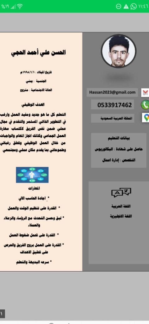 ازغب بوظيفة مدخل بيانات ومعالجة النصوص ولدي مهارة في الكتابة باللمس 40 - 45 كلمة في الدقيقة ولدي دورة كاملة في ادخال البيانات وأجيد التعامل مع المنصات الالكترونية مثل ابشر ومقيم ومركز الأعمال السعودي والبلديات والغرف التجارية ومنصة قوي والتأمينات الاجتماعية ومساند وجميع أنواع التأشيرات وجميع أنواع التأمين خبرة 4 سنوات في مجال الخدمات الالكترونية