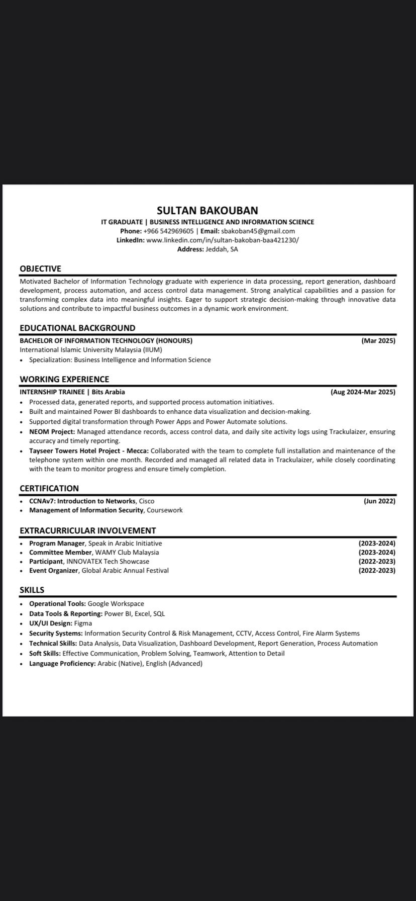 أنا سلطان باكوبن، خريج حديث ابحث عن فرصة عمل في ادخال البيانات. ممتاز في استخدام Excel وSQL، وأسعى أطور نفسي أكثر في المجال وأكتسب خبرة عملية. دقيق في العمل ومنظم وجاهز للبدء إن شاء الله