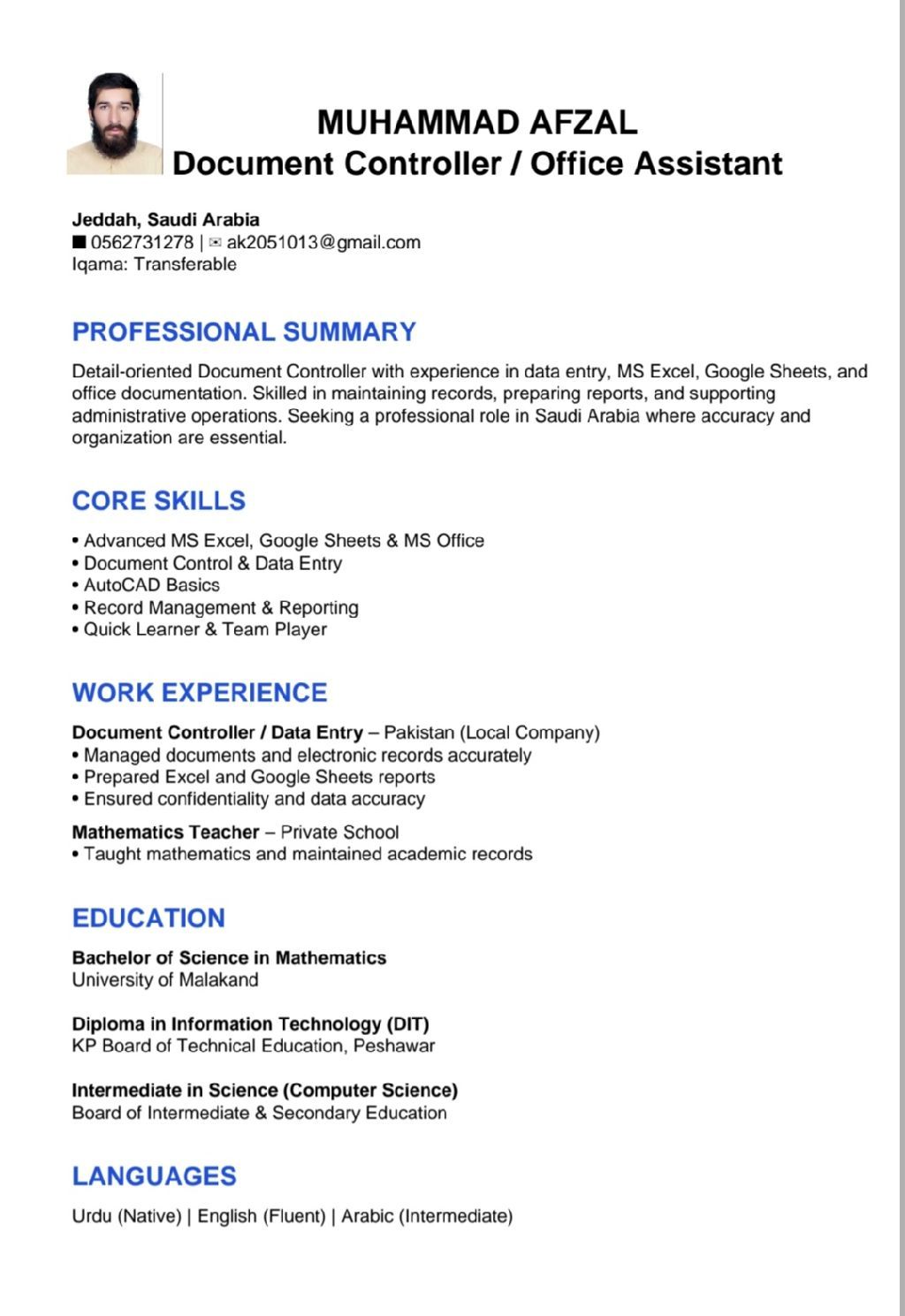 I am Muhammad Afzal Nationality Pakistani looking for a job as a document Controller/ Data Entry operator/ Account Assistant/ Reporting Analyst I have more than 3 years experience in Al sultan cement Industrial 6 months in loko moto factory in Pakistan