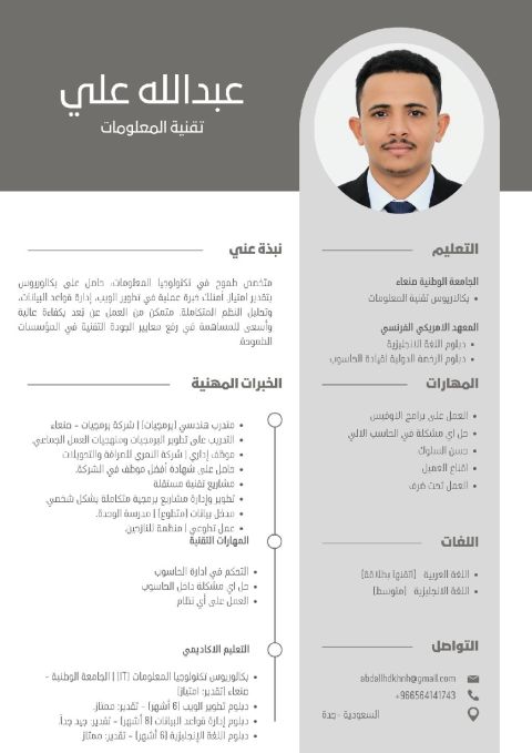 علاء عادل مصري الجنسية من مواليد السعودية العمر 30 سنة حاصل على بكالوريوس في اللوجستيات وسلاسل الإمداد من الأكاديمية العربية للعلوم والتكنولوجيا والنقل البحري المهنة سائق خاص بإقامة ورخصة قيادة ساريتين امتلك مهارات قوية في استخدام الحاسب الآلي وبرامج Microsoft Office سرعة ودقة في ادخال البيانات عملت في مكتب خدمات لمدة 7 شهور ومشرف في منتجع سياحي لمدة 5 شهور