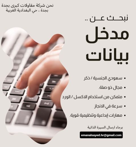 اعلان عن شاغر وظيفي مدخل بيانات لشركة مقاولات في جدة حي البغدادية الغربية