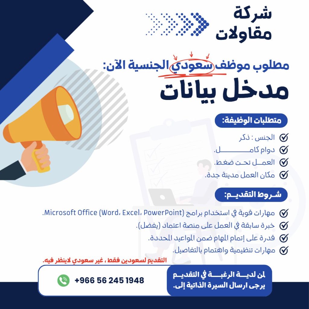 توظيف فوري - مدخل بيانات تعلن شركة مقاولات بمدينة جدة - حي البغدادية عن توفر وظيفة المسمى الوظيفي مدخل بيانات الجنسية المطلوبة سعودي فقط المتطلبات اجادة استخدام برامج Microsoft Word وExcel الدقة في ادخال البيانات والتنظيم الالتزام والانضباط في العمل للتقديم