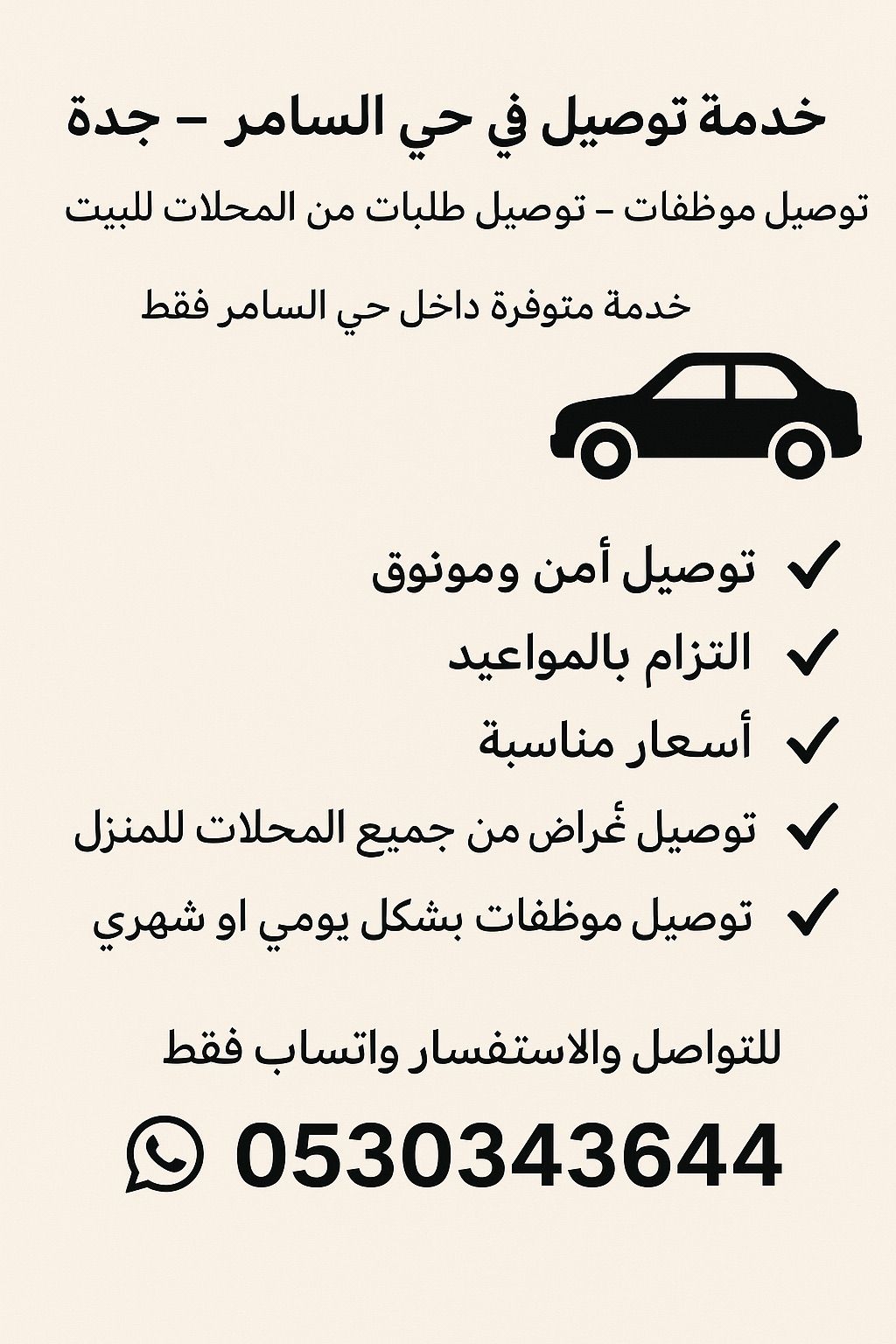 خدمة توصيل في حي السامر - جدة توصيل موظفات - توصيل طلبات من المحلات للبيت خدمة متوفرة داخل حي السامر توصيل آمن وموثوق التزام بالمواعيد أسعار مناسبة توصيل أغراض من جميع المحلات للمنزل توصيل موظفات بشكل يومي أو شهري للتواصل والاستفسار