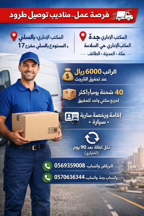 فرصة عمل - مناديب توصيل طرود الرياض (المكتب الاداري والمستودع بالسلي مخرج 17) جدة (المكتب الاداري حي السلامة) وتشمل مكة، المدينة، الطائف الراتب 6000 ريال عند تحقيق التارجت 40 شحنة يوميا أو أكثر حسب القدرة لمربع سكني واحد لتحقيق الهدف إقامة ورخصة سارية + سيارة نقل كفالة بعد 90 يوم (اختياري) للتواصل (واتساب الرياض) واتساب جدة والمناطق)