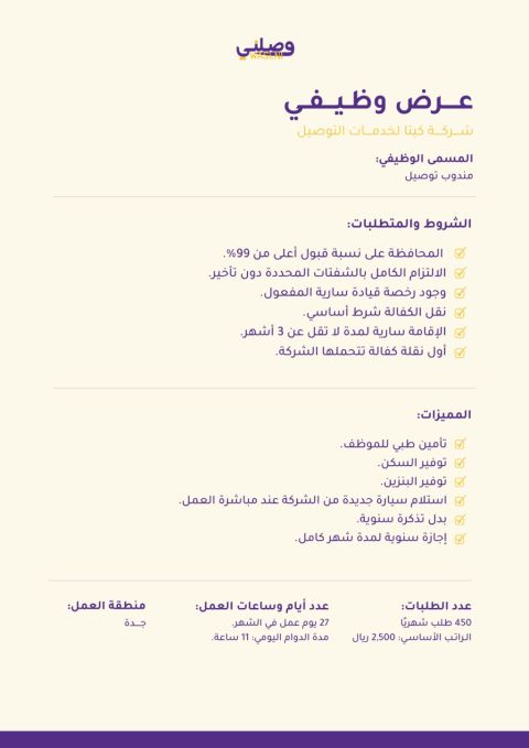اعلان توظيف رسمي تعلن الشركة عن حاجتها الى سائقي توصيل طلبات مطاعم للعمل داخل مدينة جدة. المميزات السيارات متوفرة من قبل الشركة - راتب مجز + حوافز شهرية الشروط إقامة سارية المفعول - رخصة قيادة سيارة سارية الالتزام والانضباط شرط أساسي الموقع جدة حي الصفا
