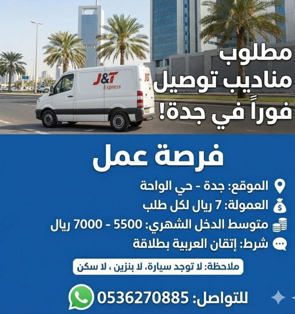 مندوب توصيل J T نوع العمل فريلانسر - دوام كامل - الهدف توصيل الشحنات بدقة وأمان مع رضا العملاء. ساعات العمل يبدأ من 9:00 صباحا العودة للمستودع بعد التوصيل لتسليم مبالغ COD والطلبات الملغاة - الأجر COD 7 ريال مدفوع مسبقا 6 ريال متوسط الدخل الشهري حوالي 5980 ريال - التدريب يومان تدريب بدون راتب أثناء التدريب - المسؤوليات توصيل الشحنات في الوقت حي الواحة