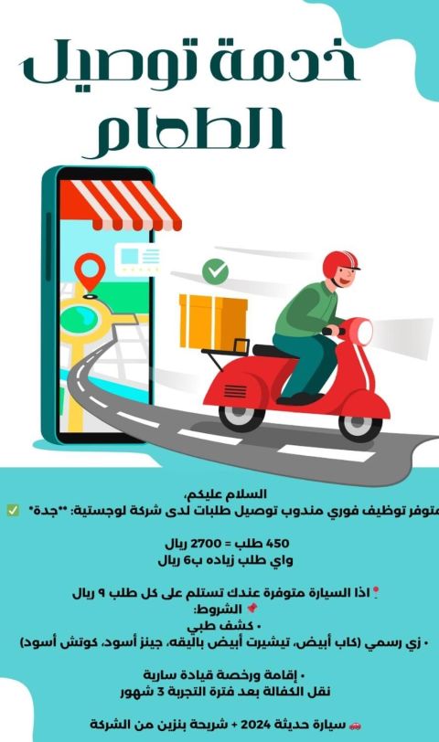 وظيفة توصيل طلبات مطاعم لدى شركة لوجستية في جدة حي الشرفية الشركة توفر (سيارة وبنزين وسكن وانترنت) التارجت المطلوب 450 طلب وبراتب 2300 بشرط اقامتك سارية فيها خمسة أشهر كحد أدنى وقابل لنقل الكفالة