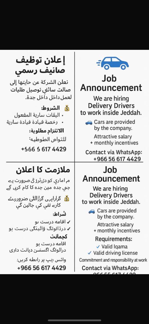 اخواني الكرام ابحث عن مناديب توصيل للعمل في جدة حي الصفا لمن لديه الرغبة يرجى التواصل معي عبر الواتساب المطلوب إقامة سارية لا تقل عن ثلاث أشهر ورخصة قيادة التواصل عبر