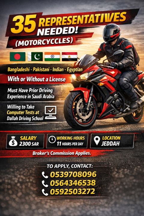 Representatives Needed (Motorcycles) Jeddah Al - Hamdaniya. Bangladeshi, Pakistani, Indian, Egyptian With or without a license Must have prior driving experience in Saudi Arabia and be willing to take computer tests at Dallah Driving School Salary 2300 SAR Working Hours 11 hours Location Jeddah Broker's commission applies