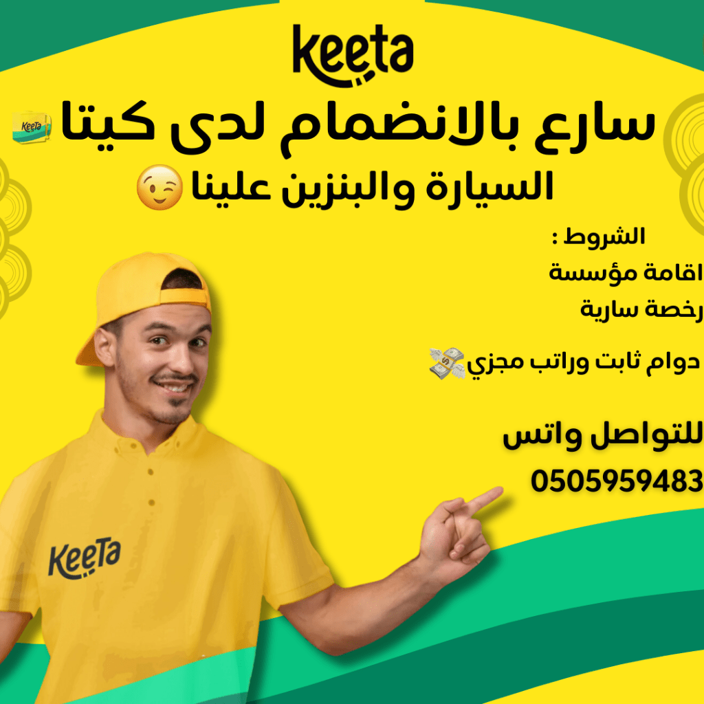 Job opportunity in Jeddah for Keeta Store delivery representatives with attractive salaries and monthly incentives and a fixed schedule without targets. We provide the car and fuel. Requirements valid residency and valid driving license. Location Al Sharafiyah District King Abdullah Road. Hurry and join now before positions are filled