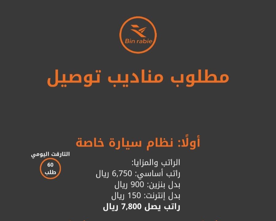 تعلن شركة BRH مقرها جدة حي الفيصلية عن فتح باب التسجيل لمناديب توصيل طرود (فري لانسر) براتب يصل الى 7800 ريال شهريا يشترط الخبرة سيارة اقامة سارية رخصة سارية جوال اندر ويد المزايا بدل بنزين + بدل نت