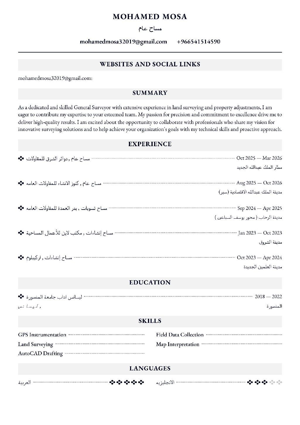 ابحث عن فرصة عمل كمساح اتقان تشغيل اجهزة total station - gps - level بدقة عالية وأنواعها المختلفة topcon - sokkia - lieca - geo max خبرة في أعمال الرفع المساحي وتوقيع النقاط وضبط المنا سيب خبرة واسعة في مشاريع الانشاءات والبنية التحتية واللاند سكيب والقطع والردم للتواصل إقامة سارية
