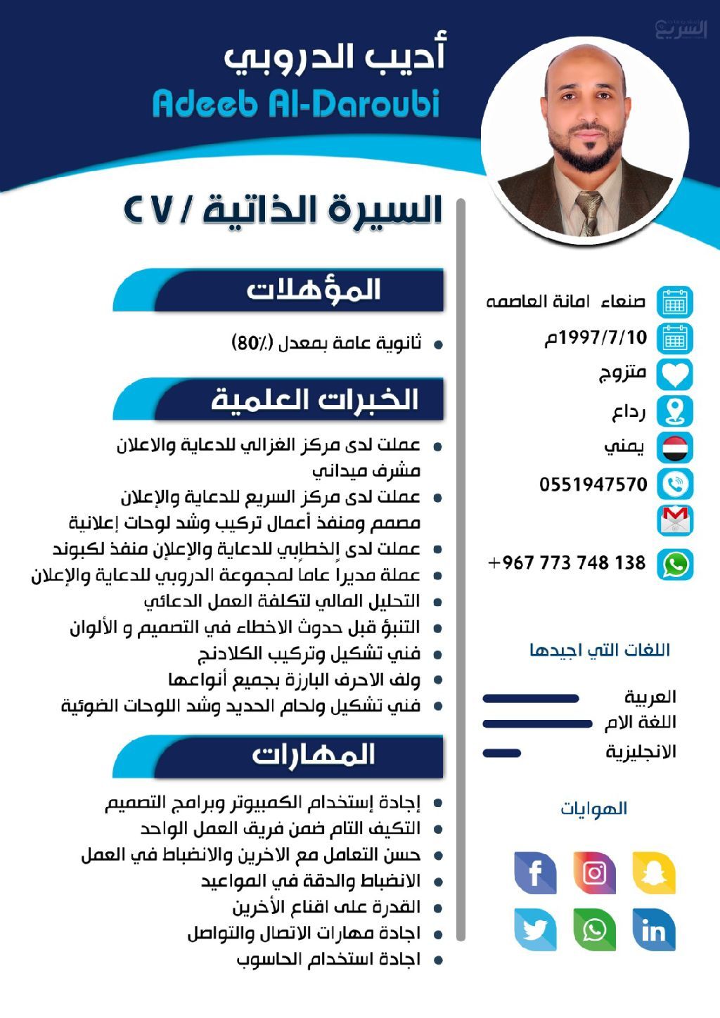 أنا متخصص في مجال الدعاية والاعلان فني كلادينج محترف ولف أحرف بارزة فني لحام معلم محترف في قص وتفريز وتركيب واجهات الكلادينج خبرة 15 سنة في المجال التكيف التام ضمن فريق العمل الواحد حسن التعامل مع الآخرين والانضباط في العمل الانضباط والدقة في المواعيد القدرة على اقناع الأخرين اجادة مهارات الاتصال والتواصل اجادة استخدام الحاسوب