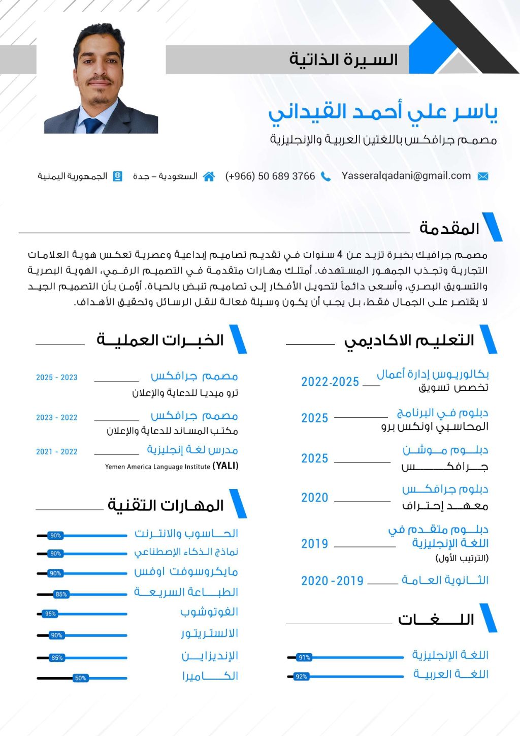 مصمم جرافكس محترف بخبرة 4 + سنوات متمكن من استخدام برامج أدوبي (Photoshop Illustrator, After Effects, Premeire) ولدي حس ابداعي عال في إدارة حسابات السوشيال ميديا والحملات الاعلانية والمتاجر الالكترونية وعمل التصاميم المطلوبة. أتميز بالالتزام بالمواعيد والقدرة من العمل ضمن فريق، وسرعة الانجاز مع الحفاظ على جودة العمل. متواجد في جدة