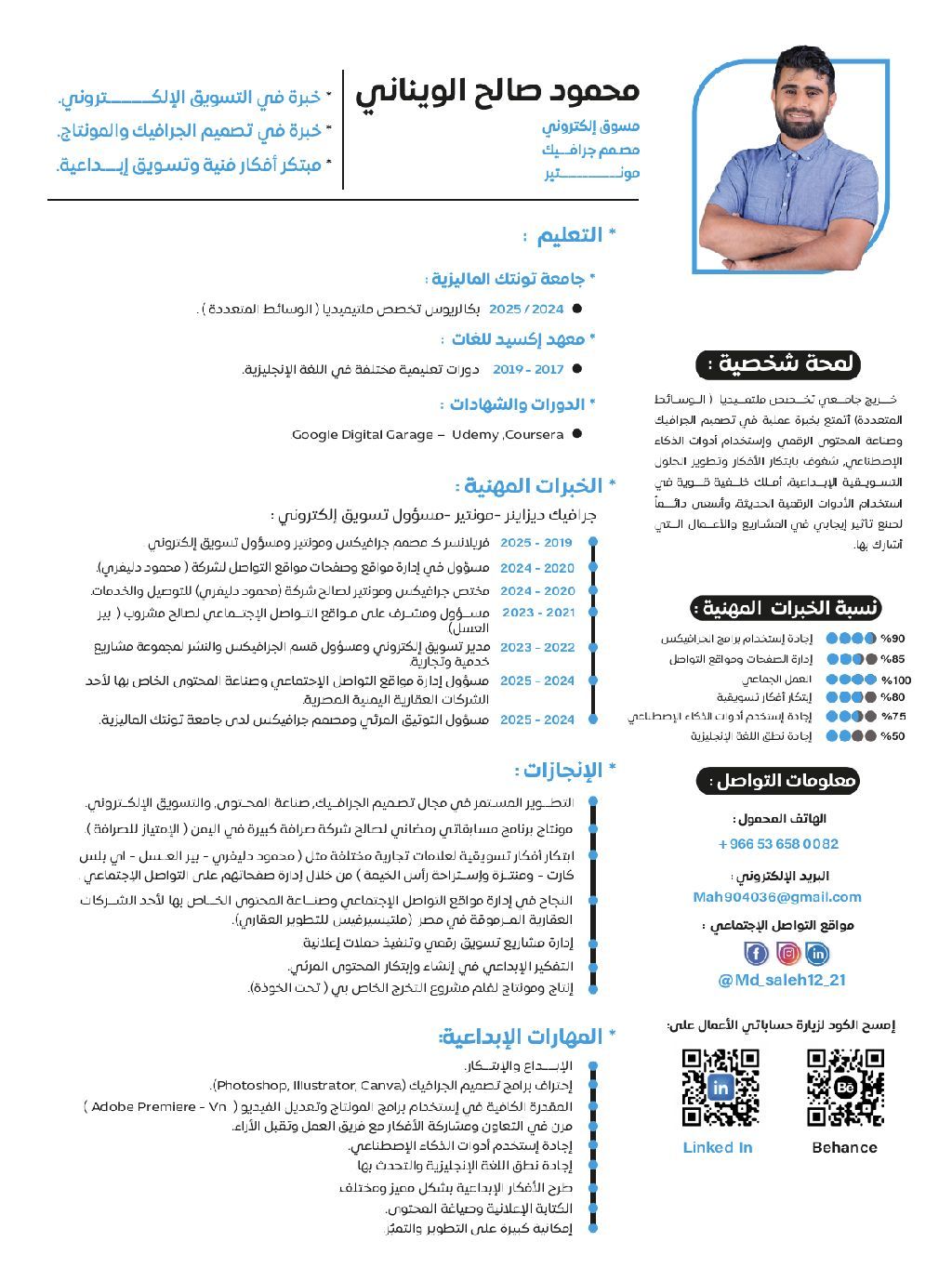 خريج جامعي تخصص ملتم ملتميديا (الوسائط المتعددة أتمتع خبرة عملية في تصميم الجرافيك وصناعة ألمحت المحتوى الرقمي واستخدام أدوات الذكاء الاصطناعي شغوف بابتكار الأفكار وتطوير الحلول التسويقية يه الابداعية، أملك خلفية قوية في استخدام ألاد الأدوات الرقمية الحديثة، وأسعى دائما لصنع تأثير أي ايجابي في المشاريع والأعمال التي أشارك بها