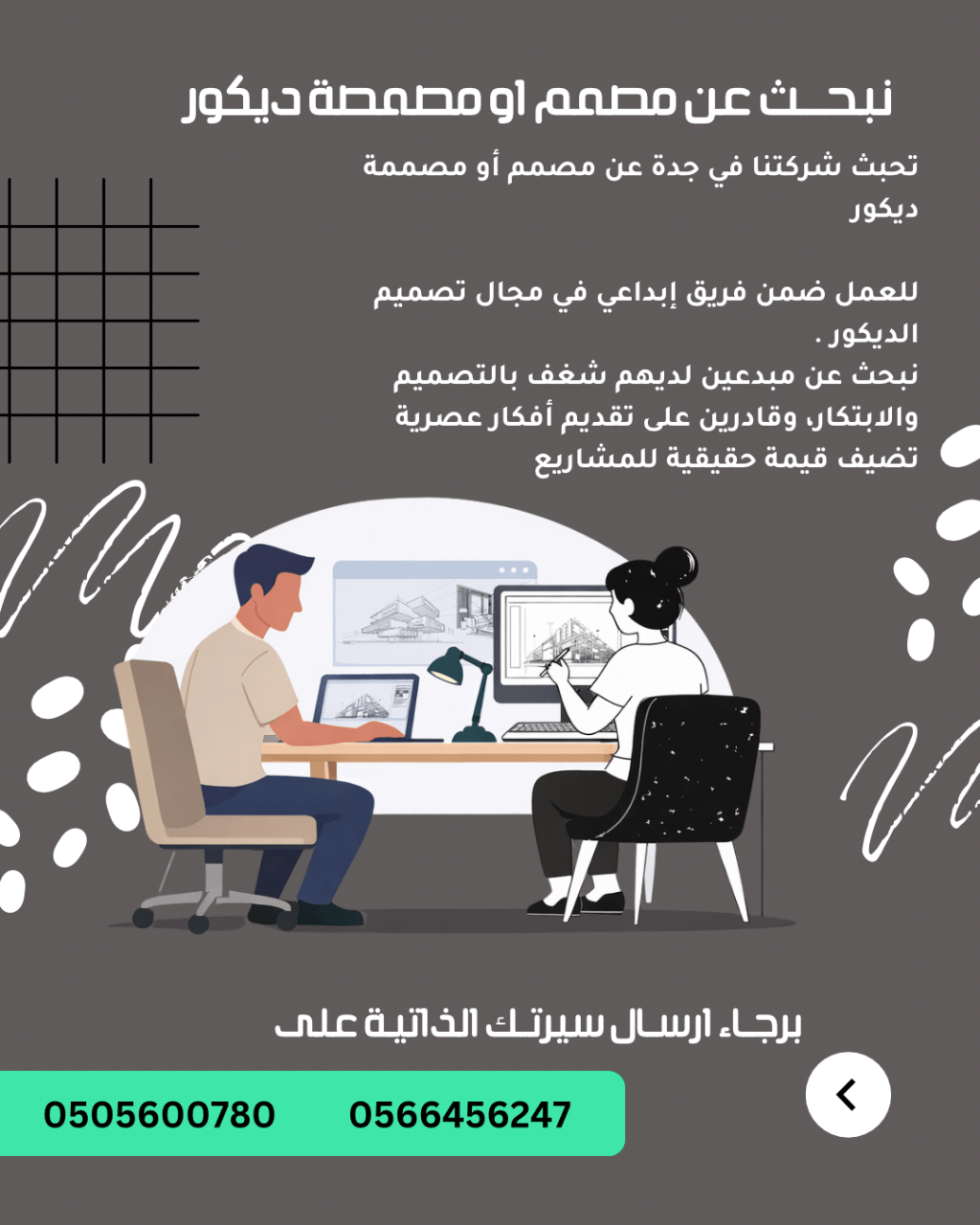 تبحث شركتنا في مدينة جدة أبحر الجنوبية عن مصمم أو مصممه ديكور للعمل ضمن فريق ابداعي في مجال تصميم الديكور. نبحث عن مبدعين لديهم شغف بالتصميم والابتكار، وقادرين على تقديم أفكار عصرية تضيف قيمة حقيقية للمشاريع للتقديم التواصل مع الأرقام التالية واتساب مع مراعاة أوقات الاتصال من الساعة 10 صباحا الى 10 مساء أو إرسال السيرة الذاتية مع المعلومات الشخصية والرجاء كتابة في عنوان الايميل
