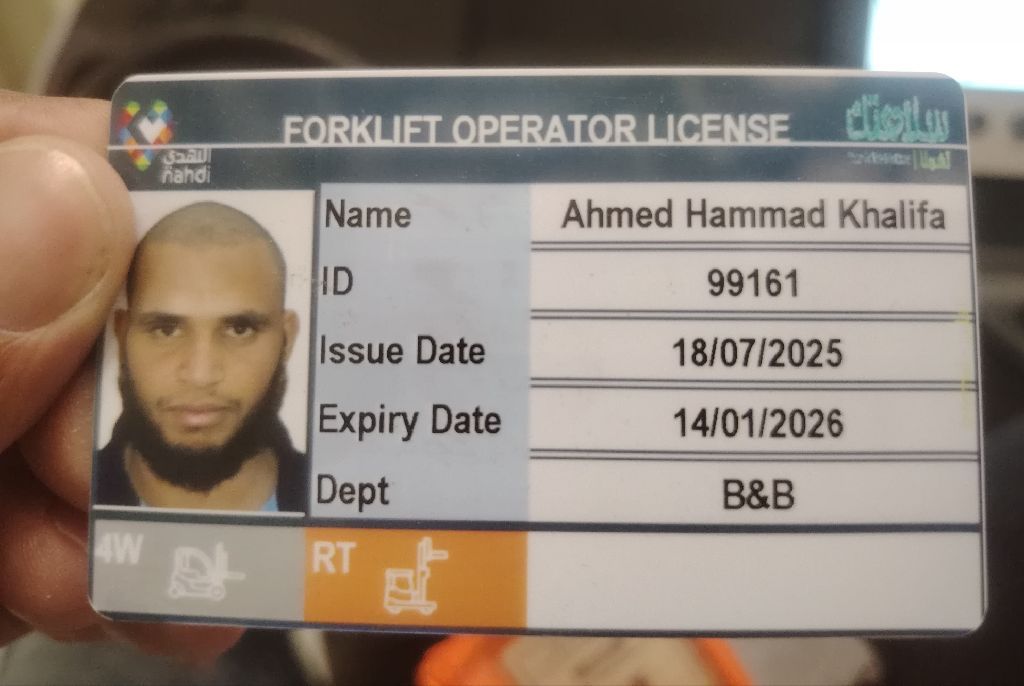 أنا أحمد أبو حماد من مصر أقامه سارية المهنية سائق رافعة شوكية سائق رافعة شوكية نوع رتش راك 11م ونوع أربع كفر ديزل وكهرباء ومعي رخصة من ادارة السلامة في الشركة خبرة أكثر من 12 سنة في المستودعات شركة النهدي الطبية ترتيب الطبالي في الرآك عل حسب تاريخ الانتاج والعمل على جهاز الإسكنر تقيم في الشركة كل سنة 4 / 5 سنوي أجد القراءة والكتابة وأتحمل العمل أكثر من 12 ساعة والله الموفق