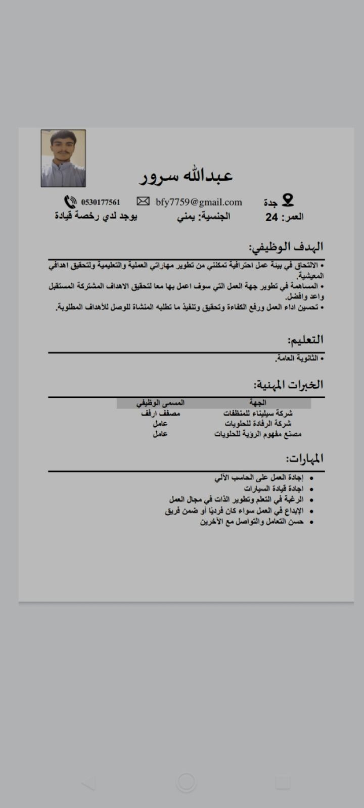 أنا عبد الله من حضرموت أتميز بالأمانة والأخلاق الحسنة وابحث عن عمل في مدينة جدة حي النخيل العمر 25 سنة لدي رخصة قيادة أبغى عمل ماشندايزر أو موصل بضاعة أو مندوب مبيعات مستعد وجاهز للعمل