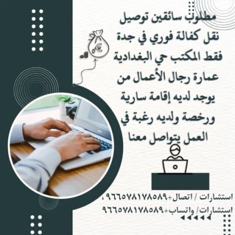 المطلوب سائقين توصيل نقل كفالة فوري في جدة فقط المكتب في حي البغدادية عمارة رجال الأعمال من يوجد لديه إقامة سارية ورخصة ولدية رغبة يتواصل على واتساب واتصال