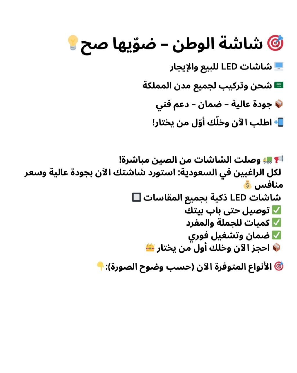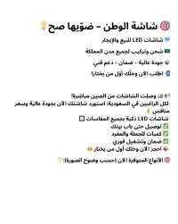 وصلت الشاشات يا بعد حيي من قلب الصين لأرض المملكة، جبنالك الشاشات الذكية بجودة ترفع الراس وسعر يكسر السوق لكل الراغبين في إيجار أو شراء شاشات نحن موجودين ومعنا الزين لكل الزينين لا تترد في طلبك يوصلك طيران