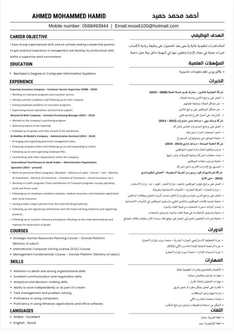 أخصائي تنظيم اداري وتنظيم أعمال الموارد البشرية (مقيم - قوى - التأمينات - مدد - وزارة التجارة - وزارة الاستثمار) وغيرها عملت على جميع المنصات الحكومية والاشراف على الأعمال الادارية المختلفة والسكرتارية ومساعد للمدير العام ومتابعة أعمال هيئة الغذاء والاستيراد والتصدير وأعمال السيارات التابعة لوزارة النقل (كروت تشغيل + بطاقات السائقين + تفاويض السيارات + تجديد الاستمارات) أجيد جميع الأعمال الاداريه والتنفيذية